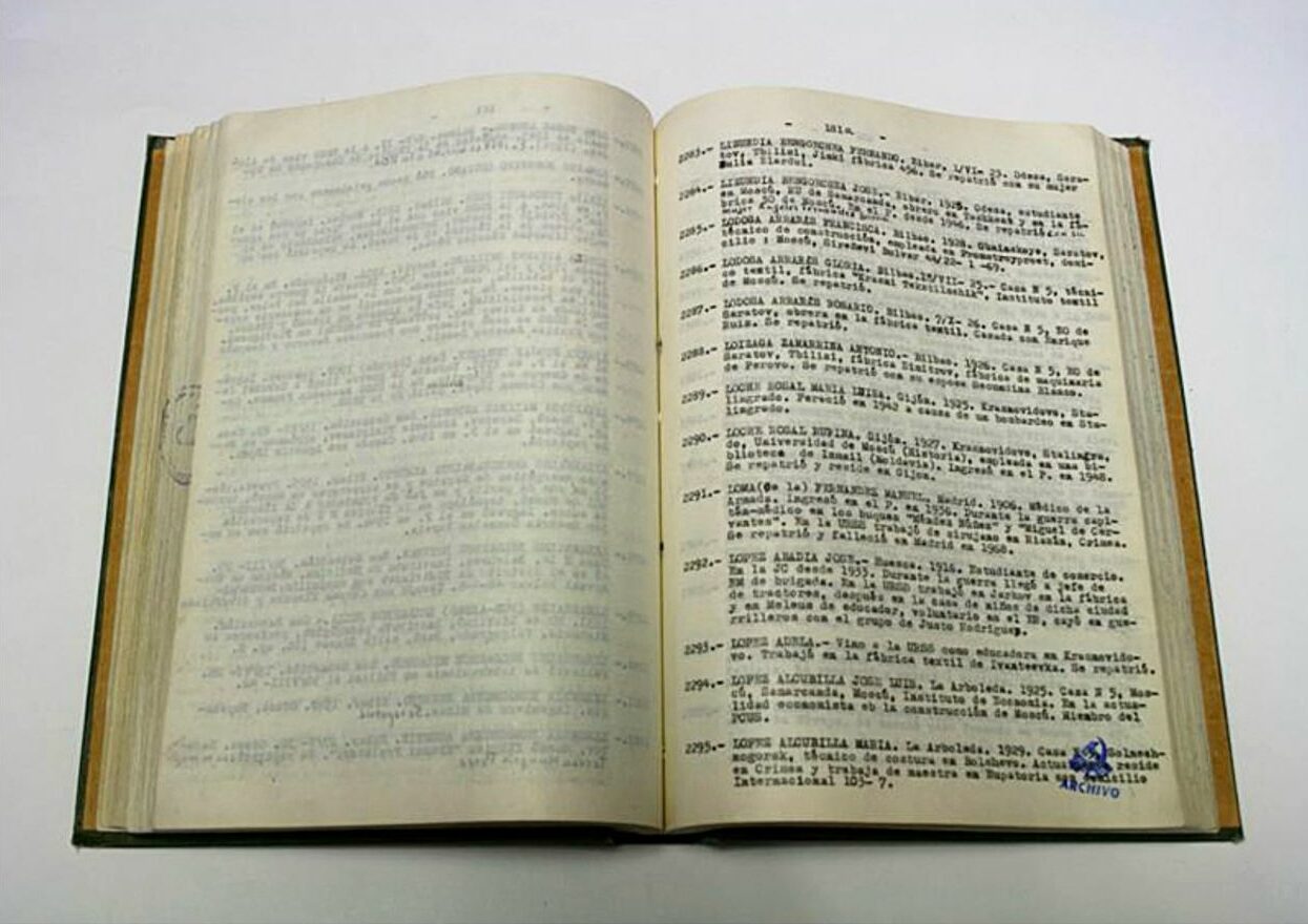El «Libro del Centro Español» de Moscú, con 4.299 entradas (2.895 niños y 1.341 adultos) ordenadas por orden alfabético, correspondientes a las personas evacuadas o exiliadas en la Unión Soviética.