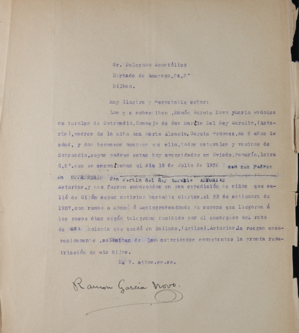 Hasta la fecha, en el contexto de las cartas de reclamación de niños evacuados solo nos consta un caso, muy especial, en el que dos hermanos, reclamados por sus padres en ese periodo, llegaron a Francia procedentes de Rusia, probablemente en los últimos meses de 1938. Se trata de Carlos y Rosa Astigarrabía Zabalegui. Curiosamente sus nombres no aparecen en el listado de españoles en la URSS. No nos consta ningún escrito referente a las gestiones que hizo su padre para sacarlos de la Unión Soviética, pero sí aparece una carta fechada el 06 de Enero de 1939 en la que la Embajada de España en Moscú hace acuse de recibo al Secretario General del Gobierno de Euzkadi (Departamento de Asistencia Social en Paris), de la recepción de un cheque como pago de los gastos ocasionados por el traslado de estos dos niños a Francia.