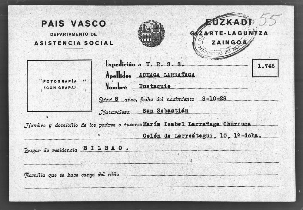 - ACHAGA LARRAÑAGA EUSTAQUIO. Nació en San Sebastián en 1929. Casa de niños de Óbninskoye y Sarátov. Después trabajó como tornero. Regresó a España con su mujer Adoración Sierra.