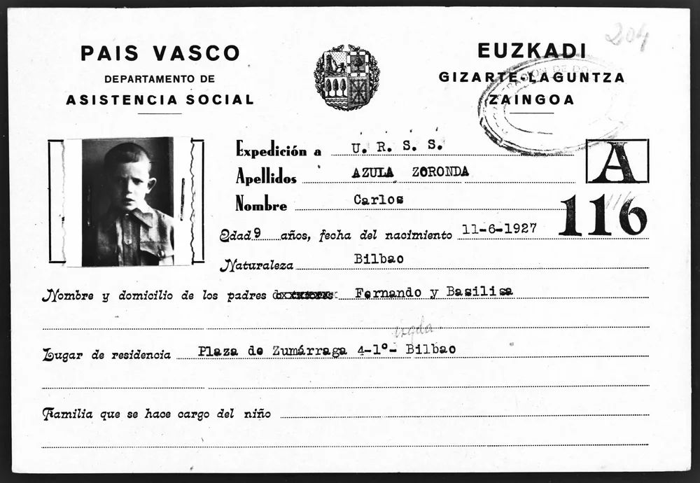 - AZULA ZORONDO CARLOS. Bilbao 1930. Odesa, Sarátov, estudiante en el Escuela de Formación Profesional N.20. Se repatrió. Sus apellidos son Azula Foronda. Así figura en los expedientes policiales del AHN realizados tras su regreso: AZULA FORONDA, Carlos Expedientes Policiales (Archivo Historico Nacional, Ministerio del Interior) | Poblacion: Bilbao (Vizcaya) | Fecha del expediente: 1957 | Notas: Repatriado de Rusia - Contiene Fotografía | Referencia: FC-Mº_INTERIOR_POLICIA_R,Exp.1502 Expedientes Policiales (Archivo Historico Nacional, Ministerio del Interior) | Poblacion: Bilbao (Vizcaya) | Fecha del expediente: 1957-1957 | Referencia: FC-Mº_INTERIOR_POLICIA_H,Exp.72050