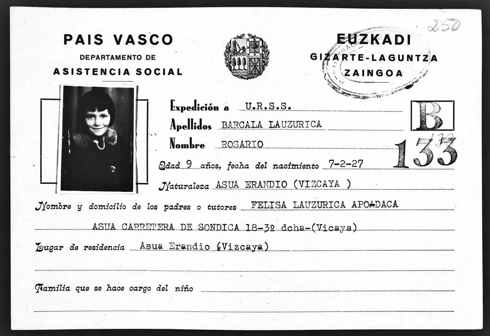 - BARCALA LAUZURICA ROSARIO. Bilbao 1928. Kaluga, casa N.12, Escuela de Formación Profesional de Krasnogorsk, obrera en Ivánovo, traductora en Intourist de Odesa. Se repatrió en 1976.