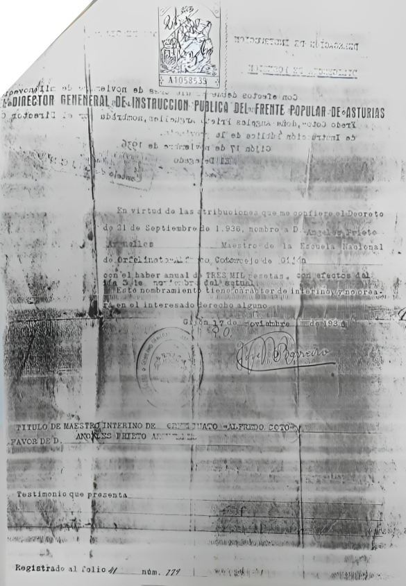 El título de maestra interina lo firma Jose Barreiro García (1908-1975), un maestro socialista de Sama de Langreo que se había curtido en las luchas de los mineros de la cuenca del Nalón. Detenido y torturado a raíz de la revolución del 34, recupera la libertad con la victoria del Frente Popular. Iniciada la guerra, con 28 años, asume funciones político-administrativas en el Comité Provincial del Frente Popular de Asturias, ocupando primero la Secretaría de Instrucción Pública y después la de Guerra. Dicho Comité fue constituido inicialmente en Sama de Langreo, siendo trasladado a Gijón el 6 de septiembre de 1936, donde ya en diciembre toma el nombre de Consejo Interprovincial del Frente Popular de Asturias y León, presidido por el socialista Belarmino Tomás. Tras una vida de lucha y un largo exilio, fallece el 17 de agosto de 1975 en la Clínica Pasteur de Toulouse.